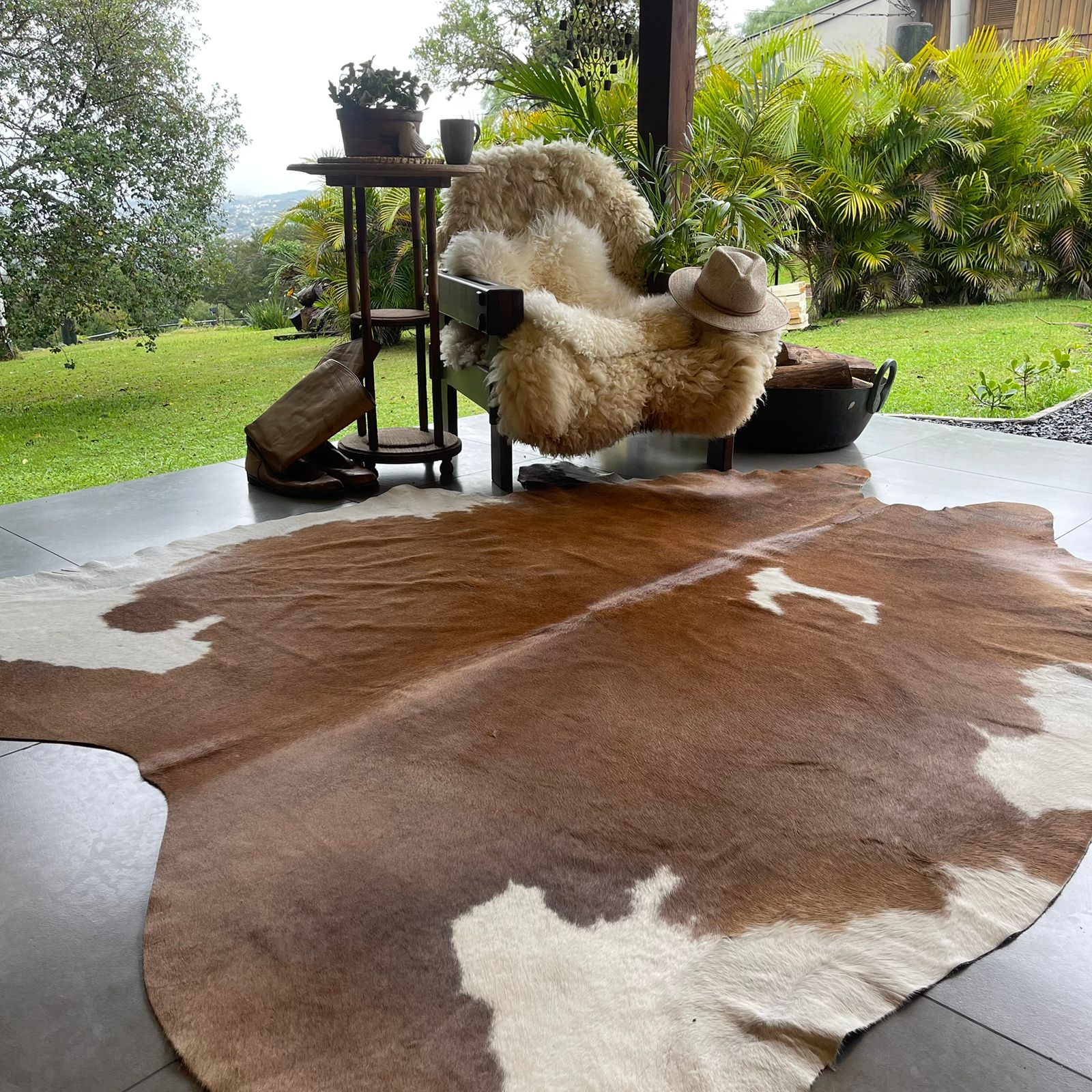 Tapete natural de couro de boi impermeabilizado medindo 2,37 x 2,17 nas extremidades.
